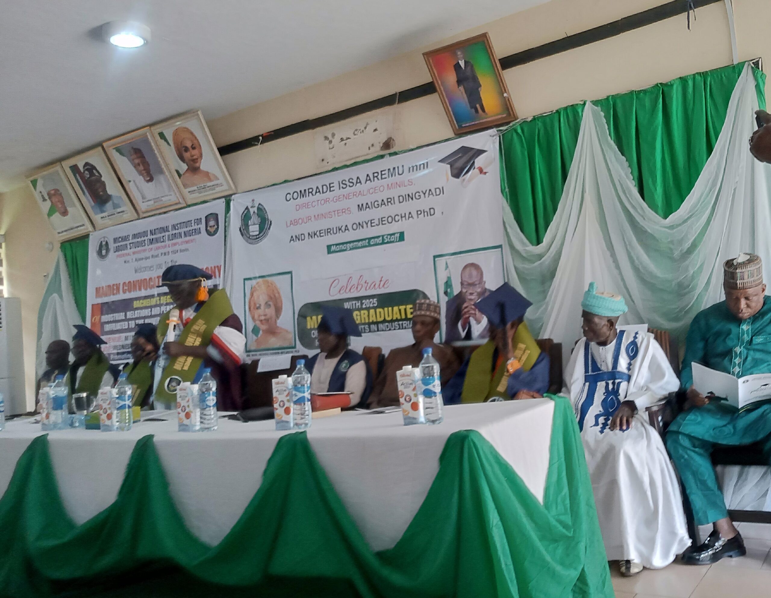 By Aminah Salako – Adekunle Educational institutions in the country have been tasked to collaborate with industry stakeholders to develop curricula that align with workforce demands. This is also to ensure a deliberate shift from theory – based curricula, to skill – driven and industry relevant one. A Keynote Speaker, at the maiden jointly convocation ceremony of Bachelor of Science Degree Programme in Industrial Relations and Personnel Management, of Michael Imoudu National Institute for Labour Studies and University of Ilorin, Frank Uzo Ehichanya, gave the charge in Ilorin, the Kwara State capital. Mr. Ehichanya represented by Mr. Ahmed Adeyemi, identified challenges in grooming future managers of people to include skills mismatch, technological disruption, soft skills deficiency and limited access to continuous learning. He however, pointed out that the issues could be resolved with curriculum reform, emphasis on soft skills, promotion of lifelong learning, mentorship, coaching, among other. The Minister of State for Labour and Employment, Barrister Nkeiruka Onyejeocha, represented by the State Controller, Federal Ministry of Labour and Employment, Mr. Orodiran Bola, advised the graduands to deploy their personal achievements for the growth of society. Barrister Onyejeocha, who said that challenges are inevitable in life, implored the students to develop resilient attitude to surmount them. Earlier in an address of welcome, Director General of the Institute, Comrade Issa Aremu, affirmed that arrangements are on to commence Professional Post Graduate courses, to complement the Renewed Hope Agenda of President Bola Ahmed Tinubu, on human capital development. Comrade Aremu said the maiden graduation ceremony by MINILS further compliments the Renewed Hope Agenda of President Bola Ahmed Tinubu on Human capital Development adding that in the two years of President Bola Ahmed Tinubu’s leadership, Nigeria’s education policies have commendably undergone significant transformation focused on inclusivity, skill acquisition, data-driven planning, and education quality enhancement. Aremu saluted President Bola Ahmed Tinubu for setting up the Nigerian Education Loan Fund, NELFUND, which he said had made hundreds of thousands indigent students access higher education adding that 10,789 students at the University of Ilorin have benefited from the NELFUND hence the need for students of its affiliated Institutions like MINILS to benefit. Comrade Aremu directed the Head of Academic Department of MINILS to leverage on the partnership with University of Ilorin to make sure that the new undergraduates of MINILS Bsc. programme benefit from NELFUND. He called for improved regular funding of Development Training labour market Institutions such as MINILS. L-R: The Best Graduating Students, Faith Funmilayo Aina, Sidiqat Opeyemi Ahmed and Miss Shehu The Vice Chancellor, University of Ilorin, Professor Wahab Egbewole, represented by Director, Centre for Affiliated Institution, Prof. Yahaya Oyewole – Imam urged the graduands to imbibe good manners while urging other students of the institute to take advantage of NELFUND to advance their career. The Coordinator of Academic Programmes, Dr. Sylvanus Adamade, explained that Twenty, out of Thirty-three pioneer students graduated, while ten of them graduated with Second Class Upper and the other ten had Second Class Lower. The Best Graduating Students, Miss Funmilayo Aina and Sidiqat Ahmed were offered automatic employment in the institute among other prizes. Post navigation Al-Hikmah University appoints Prof. Lateef Oladimeji as 6th Vice-Chancellor UNIOSUN Recruits More Lecturers, Matriculates over 400 New Students